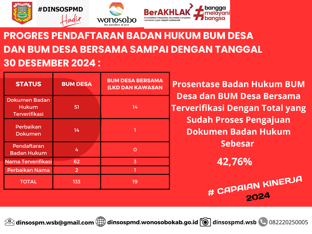 Untuk progres pendaftaran badan hukum BUMDES/BUMDESMA sampai dengan tanggal 30 Desember 2024 terdapat 42,76% BUMDES/BUMDESMA berbadan hukum.
