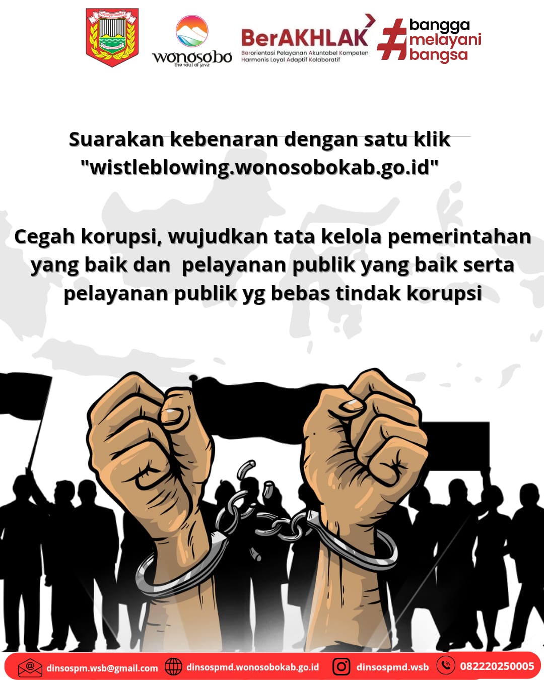 Mari bersama mewujudkan permerintahan yang bersih dan bebas dari korupsi. Laporkan setiap dugaan tindak korupsi melalui laman resmi whistleblowing.wonosobokab.go.id. Suara anda penting untuk perubahan yang lebih baik.