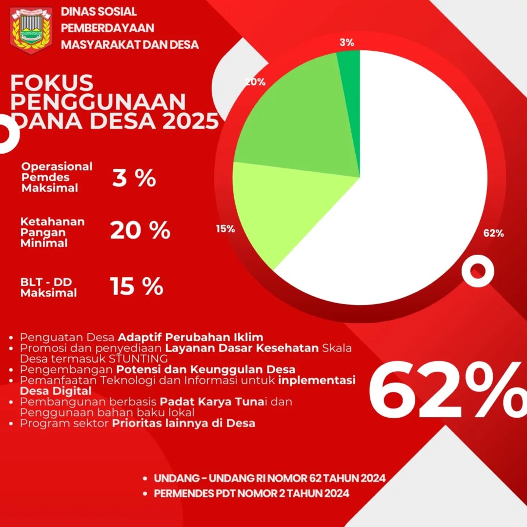 Berdasarkan Undang-undang RI Nomer 62 tahun 2024, dan Permendes PDT Nomer 2 tahun 2024, fokus penggunaan dana desa tahun 2025 terdiri dari:
