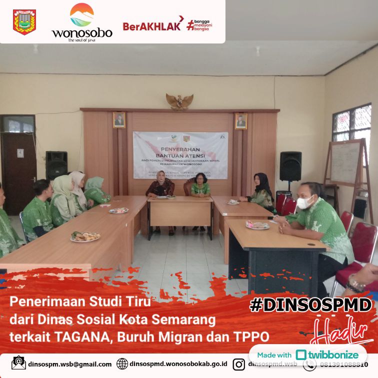Pada hari ini, Kamis 5 September 2024, Ibu Kepala Dinas Sosial PMD Kabupaten Wonosobo menerima kunjungan dari Dinas Sosial Kota Semarang @dinsoskotasmg dalam rangka studi tiru mengenai penanganan TPPO, TAGANA dan penanganan anak terlantar di Kabupaten Wonosobo.